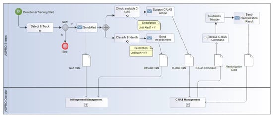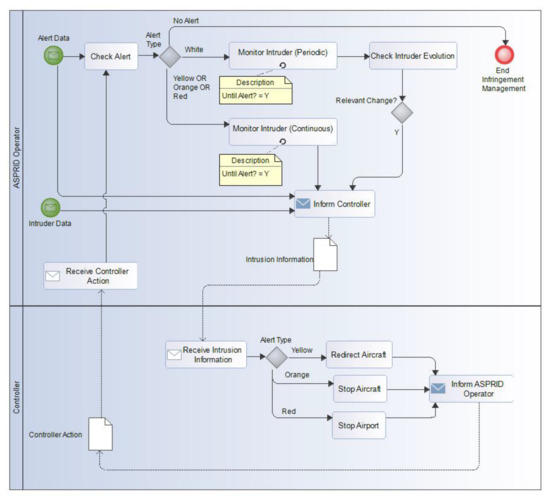 Figure 3 reports a tabular view of ASPRID’s operational procedure, which is based on the aforementioned alert classification. The procedure addresses the actions to be performed by ASPRID operators and controllers (i.e., ATCOs), including tower controllers, ground controllers, and controllers for the terminal maneuvering area (TMA). These actions are triggered by specific conditions, which are mainly related to the alert levels in Figure 2. Only one condition is associated with the availability of a C-UAS action to neutralize an intruder drone: in this case, the ASPRID operator proceeds to issue the neutralization command only if authorized by the ATCO, who is responsible for checking that there are no moving aircraft near the target drone in order to avoid collateral damages. These guidelines are graphically specified in Figure 4 and Figure 5, which, respectively, illustrate the BPMN process diagrams of the main process and of the infringement management subprocess within the ASPRID operational procedure. Note that, in Figure 4, the C-UAS management subprocess also includes LEAs; in Figure 5, the controller swimlane refers to ATCOs. Moreover, we assume that the main BPMN process (Figure 4) implies periodic detection and tracking for the ASPRID system; thus, the process starts on recurring moments in time by means of a timer start event.