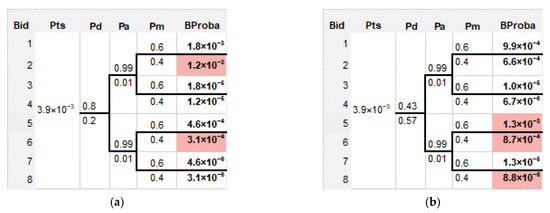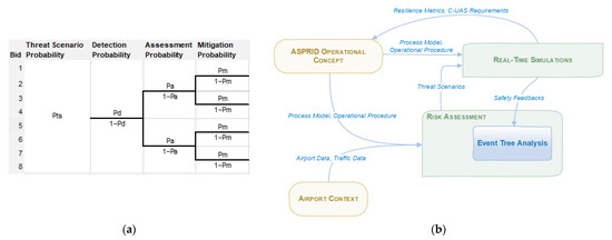 Reference [14] provides a detailed description of the risk assessment of drone intrusions in airports, including event trees. The generic structure of such event trees is shown in Figure 7a, wherein the probability of a branch is computed by using: