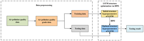 This section introduces the data preprocessing conducted before the air quality grade prediction based on the LSTM network. We also represented the hunter–prey optimization algorithm to optimize a more powerful LSTM network structure. The proposed method includes the three major steps: (1) data preprocessing, that is the air quality data are disposed of as grade data; (2) the hunter–prey optimization algorithm that determines the optimal hyperparameter of the LSTM network structure; and (3) the LSTM network via the optimization of the hyperparameters employed for the training and testing of grade data. The flowchart of the proposed method is shown in Figure 2.