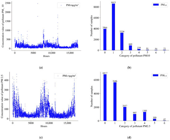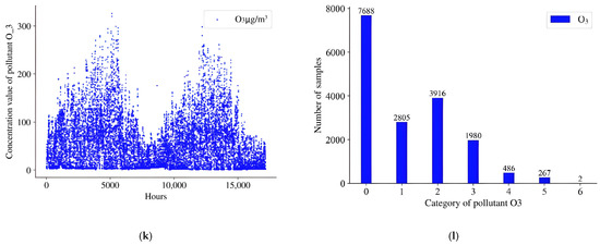 After classifying the concentration value interval of air pollutants according to Table 3, some classified pollutant quality grade data were concentrated in grade 0. To solve this problem, we redivided the pollutant concentration intervals into corresponding pollutant quality grades based on Table 2, according to the data distribution of pollutants whose concentration values were concentrated in category 0, as shown in Table 4.