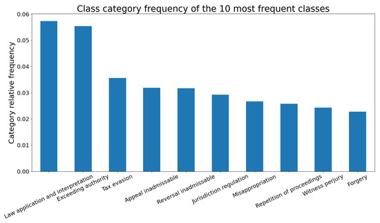 Our dataset spans more than a quarter of a century, the years 1990–2018, and is organized into 504 unique Court case categories. The data are over-dispersed over the categories’ labels as the average category frequency is 0.198% with the standard deviation equal to 0.5549%. Furthermore, the category labels correspond to quite different other Court cases, indicating high diversity in our dataset. Figure 1 highlights the 10 most-frequent case category labels.