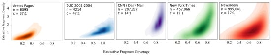 A comparison of the extractive fragment coverage - extractive fragment density relationship for the AreiosPagos dataset compared to other text summarization datasets. Data observations are plotted using a kernel density estimate method. n denotes the number of documents in the dataset, and c refers to the compression ratio of the main text’s length over the summary’s length. Leftmost: the AreiosPagos dataset. Right: news domain datasets as reported in [17]. The AreiosPagos dataset is homogeneous in terms of coverage, as a moderate percentage of words in the summary appear also in the main text. In terms of extractive fragment density, the AreiosPagos dataset shows less variance than the other datasets, while having generally low scores.