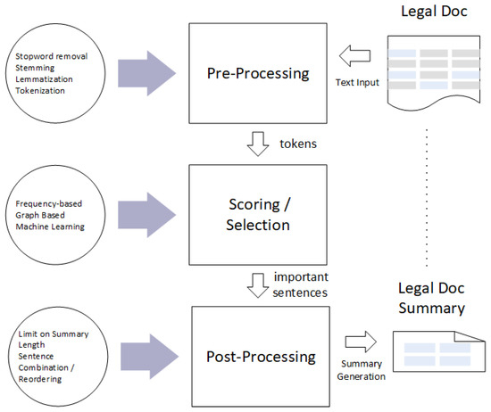 Figure 3 provides a visual overview of the basic steps of extractive text summarization: text pre-processing, processing, and post-processing.