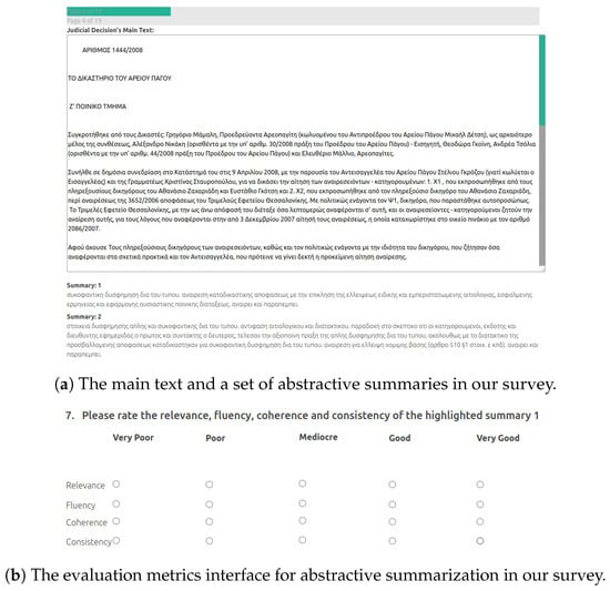 Additionally, we employed and adapted to the specific context well-known extractive summarization algorithms, LexRank and Biased LexRank. We also modeled abstractive summarization as a sequence-generation task, by training and utilizing an encoder–decoder deep learning model based on the BERT architecture (Section 4). We evaluated both of our approaches, extractive and abstractive, by conducting a human evaluation study, as well as utilizing automatic evaluation metrics, providing a detailed comparison of different variations of our extractive and abstractive summarization methods (Section 5).