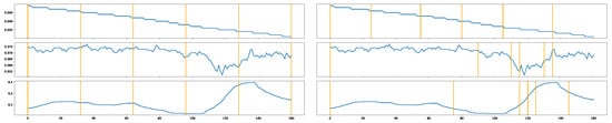 Segmentation approaches: uniform segmentation (left) and minimal error segmentation (right). X-axis is the time dimension and y-axis are three different time series. The orange vertical lines are the separators between segments.