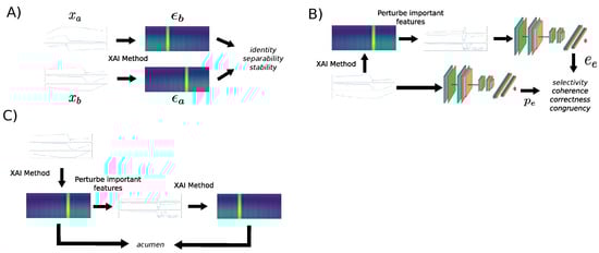 This study uses the most relevant quantitative proxies found in the literature [,], to evaluate and compare each method. Different methodologies need to be followed depending on the proxy used to evaluate the interpretability of machine learning models. These methodologies are depicted graphically in Figure 3. Approach A involves using different samples and their corresponding explanations to compute metrics such as identity, separability, and stability. In approach B, a specific sample is perturbed using its own explanation, and the difference in prediction errors (between the original and perturbed sample) is computed. This methodology is used to evaluate metrics such as selectivity, coherence, correctness, and congruence. Approach C involves using the explanation of the original sample to build the perturbed sample, then the explanations from both the original and perturbed samples are used to compute the acumen proxy.
