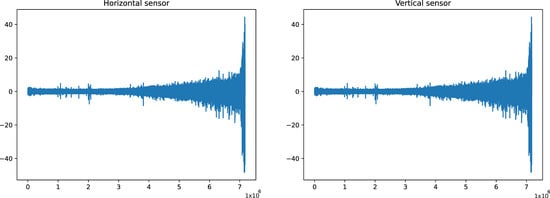 They employed two sensors, set in the x-axis and y-axis of the bearing. The data were acquired every 10 s for 0.1 s, with a frequency of 25.6 kHz. Therefore, each time series has 2560 data points. The experiment was stopped when the vibration amplitude exceeded the threshold of 20 g. It is assumed that the remaining useful life (RUL) will decrease linearly from the maximum value (total time of the experiment) to 0. For this experiment, the RUL is normalized to be between 0 and 1. Figure 5 shows the two full history signals of one of the bearings.
