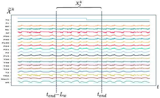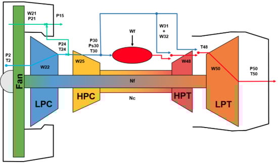 The Commercial Modular Aero-Propulsion System Simulation (CMAPSS) is a modeling software developed at NASA. It was used to build the well known CMAPSS dataset [] as well as the recently created N-CMAPSS dataset []. N-CMAPSS was created providing the full history of the trajectories starting with a healthy condition until the failure occurs. A schematic of the turbofan model used in the simulations is shown in Figure 6. All rotation components of the engine (fan, LPC, HPC, LPT, and HPT) can be affected by the degradation process.
