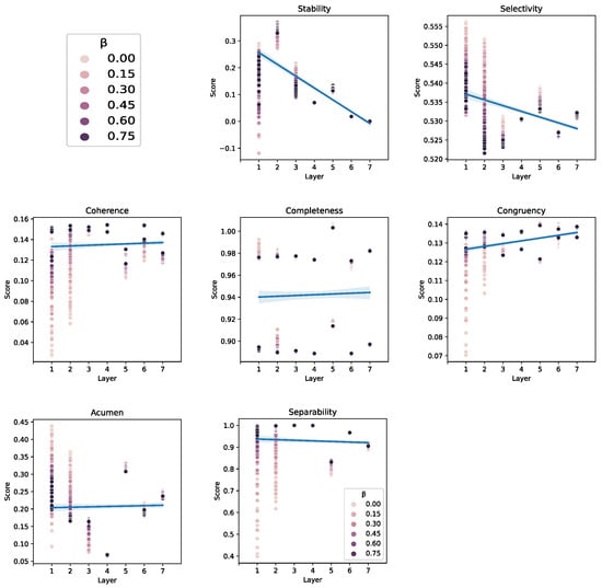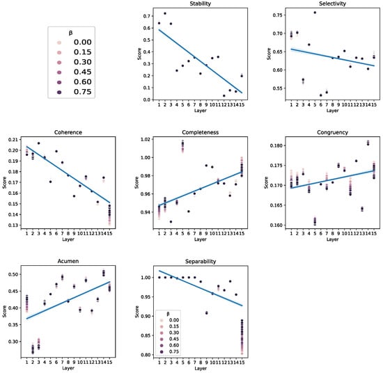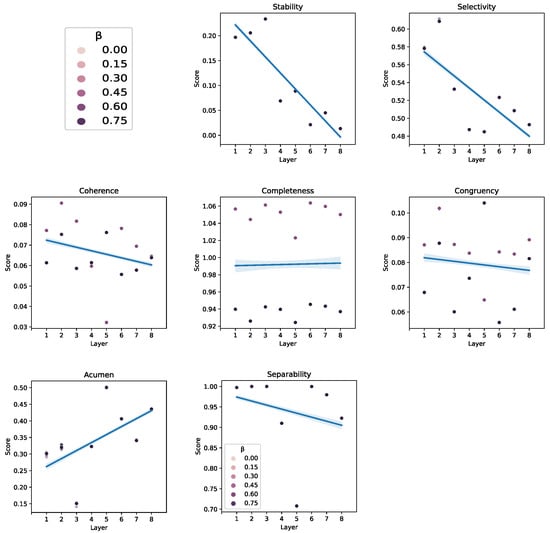 Since Grad-CAM tends to produce the best results in a few of the proxies, it is considered the more robust method. Further analysis has been carried out to understand the behavior of the method under different settings for each of the studied proxies, with the exception of the identity proxy, which is always 1 in Grad-CAM. Figure 10, Figure 11 and Figure 12 compare the scores obtained by Grad-CAM when applied to each convolutional layer of the DCNN. Table 6 summarizes the kind of correlation of each proxy with the depth of the layer in the network. The selectivity, stability, separability, and coherence proxies tend to have an inverse correlation with respect to the depth of the layer. Conversely, the acumen proxy presents a direct correlation with the layer depth.