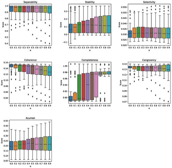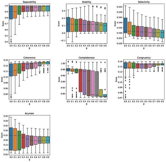 Figure 13 shows the influence of the time contribution, which is controlled by the factor . The factor being discussed shows a direct correlation with all proxies except completeness, selectivity, and acumen, which exhibit an inverse correlation. In general, it can be concluded that increasing the weight of the time dimension in Grad-CAM could be beneficial for explainability in time-series for RUL.