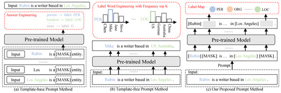 - Ma, R.; Zhou, X.; Gui, T.; Tan, Y.; Li, L.; Zhang, Q.; Huang, X. Template-free Prompt Tuning for Few-shot NER. In Proceedings of the 2022 Conference of the North American Chapter of the Association for Computational Linguistics: Human Language Technologies, Seattle, WA, USA, 10–15 July 2022; pp. 5721–5732. [Google Scholar]