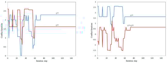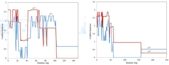 In variants 5a and 5b, the values and , respectively, were achieved with a given maximum value , which is a good compromise, but the conflict levels of participants in these cases () and (), respectively, remain quite high.