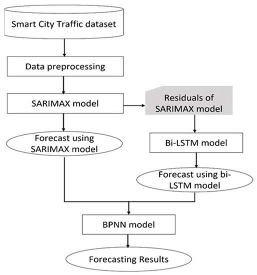 This study proposes a hybrid SARIMA + Bi-LSTM model optimized using BPNN to predict traffic congestion using a univariate time-series IoT dataset. The proposed hybrid model uses two prediction models: one is statistical and the other is a machine learning model. SARIMA, which is a statistical model, is used to train linear components of the dataset, and Bi-LSTM, which is a machine learning model, is used to train nonlinear values of the time-series IoT dataset. After training the linear and nonlinear values of the dataset, these predictive models are used for forecasting. Predicted results are then fed into the BPNN, which helps to readjust the neurons’ weights and reduces errors. The pseudocode of the proposed model is given in Algorithm 1.