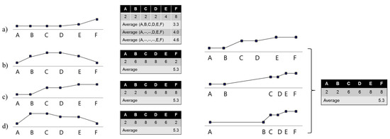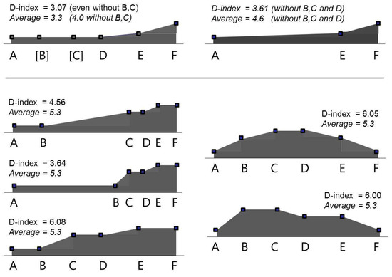 Figure A1 illustrates this situation, elaborating on the example already presented in Figure 3(top). As shown in the tables, the D-index of the first A–C section of the journey is 2.0, while the D-index of the second C–F section of the journey is 3.7; as the A–C section is 22 units long and the C–F is 37 units long, the global D-index can be obtained by composing the two sub-indices by factors of 22/59 and 37/59, respectively.