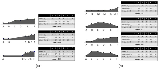 This continues to hold if the delay either grows or decreases linearly in section A–F, meaning that it has the “proper” proportional intermediate value at the new intermediate point. Graphically speaking, it means that the new delay measured at the extra point E’ is aligned with the two adjacent delays (Figure A2(left)). If these conditions do not hold (Figure A2(right)), the property does not hold either; of course, the lower the deviation from the scenario in which it holds, the more it can be taken as “approximately” valid for practical purposes.