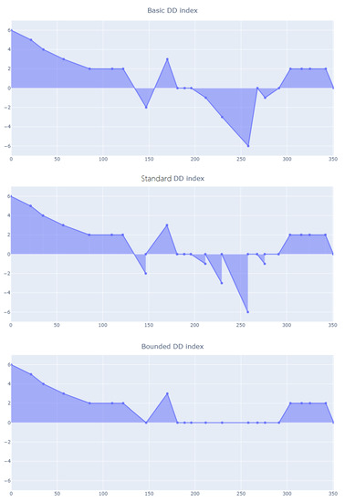 The delay diagram can now contain discontinuities, as the left-hand side of each area section is zero-bounded while the right-hand side is not. Figure 4 illustrates the difference between the basic DD index (top) and the standard DD index (center) for the same train. Analogous diagrams could be made for DT indices.