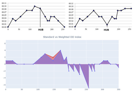 DT indices instead adopt a temporal metrics, that is, the distance between the sampling points on the X-axis is the time spent by the train to cover that journey according to its schedule. Such a metrics is “relative”, as the coefficients are specific to that train; this approach emphasizes a more “dynamic” view, with train performance evaluated based on what that specific train was supposed to do, rather than a fixed scale. Of course, in periodic timetables adopting the same schedule for all trains in a given category, the DT indices of trains in the same category are mutually comparable, the same as if DD indices were used.