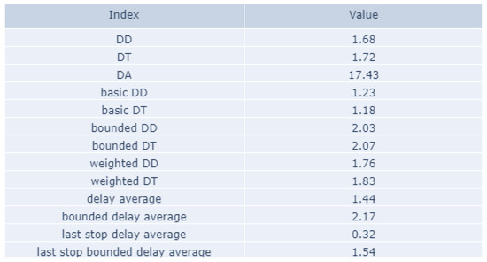 The reason for defining a family of indices rather than a single one is that a single indicator can hardly represent the multi-facet reality of passengers’ experience [13]; in particular, whether to either award early arrivals as a sign of good performance or conversely to consider them as poor performance is a key issue leading us to distinguish among basic, standard, and bounded indices. In addition, whether to prefer a “static” view, such as the one provided by space-based indices, or to opt for a more relative and “dynamic” metrics, such as the one provided by time-based indices, is another issue, and reflects the user’s preference for evaluating train performance, either on a fixed scale or based on what the specific train was supposed to do. The delay-absolute index makes it possible to evaluate the train performance in a way that is uninfluenced by the journey time, while weighted indices make it possible to assign more weight to those delays that impact more passengers.