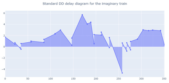 To illustrate such aspects, in the figures throughout this paper we adopt a kind of distance–time diagram—henceforth called the delay diagram—to map the registered delay at each sampling point (train stops or other points of interest along the train line). The diagram reports the sampling points on the X-axis (possibly reflecting their mutual distance, as described below), and the corresponding delays on arrival on the Y-axis; in this way, delays are not merely “counted” in a formula, instead being directly related to the expected train journey (the sequence of sampling points) and schedule (a perfectly on time train would have its graph fully overlapping the X-axis). Actually, many kinds of time–distance diagrams are of standard use in railway operation and planning; while an overview is outside the scope of this paper, interested readers can refer to [23] for an in-depth discussion.
