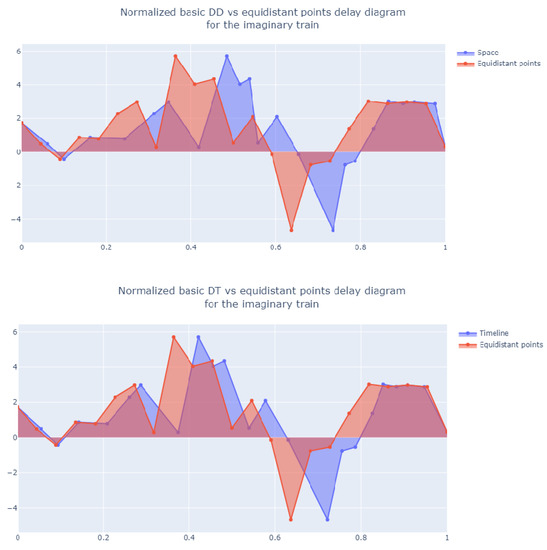 In order to further investigate the difference between the D-indices and the average of delays, it is worth comparing space- and time-based representations of delay at each stop (i.e., DD/DT basic indices) vs. a representation in which the sampling points are equidistant (i.e., uninfluential), which recalls the standard average of delays (Figure 10) in which space/time distances on the X-axis are normalised to an a-dimensional 0-1 interval. Blue areas represent basic D-indices, while red areas the equidistant version, recalling the standard average. Overall, these diagrams confirm that the viewpoints provided by DD and DT indices, that is, space vs. scheduled time, are similar as concerns their ability to capture the overall train behaviour, whereas equidistant points, recalling the plain average approach, are inherently different. In particular, DD and DT are obviously similar for lines where the schedule is planned assuming about the same commercial speed for all/most of the trains; in such cases, what actually matters is clearly just the spatial distance among the sampling points.