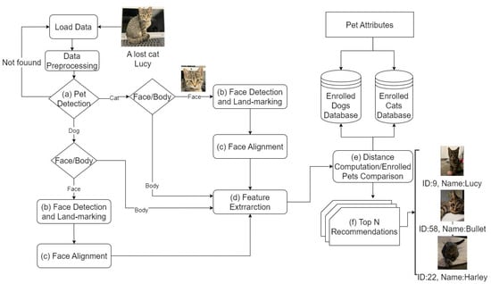 - Comparison. Face alignment techniques provide us with a baseline for comparing different animal faces together. However, due to numerous possible poses of an animal’s body captured from various angles, it is cumbersome to define landmarks for each pose for each animal. In turn, this will negatively affect the time and efficiency of the algorithm. Accordingly, the alternative solution is to encourage animal owners to upload more images of their animals to their profile to increase the possibility of having a similar pose to the query image of the lost pet. Thus, the comparison of the faces is performed after alignment, and the comparison of the body is performed without alignment (Figure 1e). We used cosine similarity. This measurement is defined in Equation (1) as follows:In this equation, x and y are vectors. The dot product of the vectors is divided by the cross product of the length of the vectors. The smaller the distance, the closer the two animals are, which means that the possibility of matching the query image with the suggested one by the model is higher;
