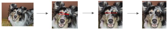 - Face alignment. Based on the labeled dataset, we elaborated on the above; we consider the eyes of the animals to be the baseline for face alignment (Figure 2c). We then calculate the angle (β) between the x-axis and the line connecting the animal’s eyes. Based on this angle, we rotate the image to align the eyes horizontally. Figure 4 illustrates an example of this procedure. We used homography transformation in the OpenCV (https://opencv.org, accessed on 3 May 2023) library. The homography function maps points in one image, in our case, eyes and other landmarks, to the corresponding points in the other image, which are the aligned images in our scenario. The homography function takes into account detected landmarks and applies the appropriate transformation. As a result, the homography function is performed based on the specific features of each animal. We compared homography with getAffineTransform (https://docs.opencv.org/3.4/d4/d61/tutorial_warp_affine.html, accessed on 3 May 2023), getRotationMatrix2D, and getPerspectiveTransformation (https://docs.opencv.org/3.4/da/d54/group__imgproc__transform.html#gafbbc470ce83812914a70abfb604f4326, accessed on 3 May 2023), which are transformation functions in OpenCV. We observed that the homography function maps and aligns images more accurately than the others;