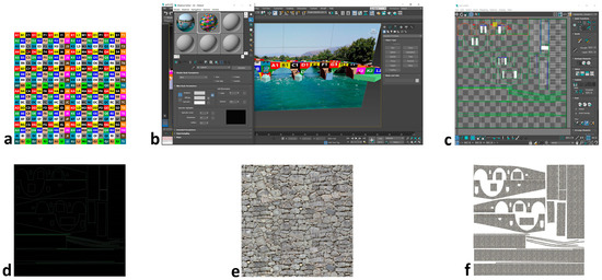 Texturing the model: (a) Texture map; (b) Texture map material; (c) Stitch, Explode, and Break; (d) UVW Template; (e) Seamless Rock Wall; (f) Template with stone texture.