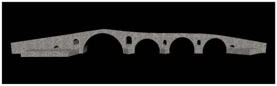 The model is then rendered into a high-quality image (Figure 4d). To give a stone texture to the bridge, an image depicting a wall similar to that of the real bridge is used (Figure 4e). The surfaces of Figure 3d are replaced with the image representing the stone wall (Figure 4f). The generated image is imported into 3D-modeling software and completes the creation of the bridge model. The final model, which can be exported for use in the Unity engine, is shown in Figure 5.