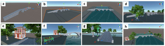 Starting the creation of the virtual world based on the corresponding real one, where the bridge is built, as well as adjacent objects, the model of the bridge created earlier is imported into Unity. With the use of the tools provided by Unity, the scale of the model is changed, and the bridge is placed in an appropriate position (Figure 6a).