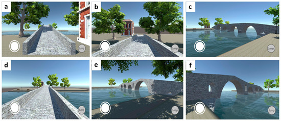 Virtual world tour: (a) West entrance of the bridge; (b) View of the folklore museum crossing the bridge; (c) Front east view of the bridge; (d) Crossing the bridge; (e) Back west view of the bridge; (f) Front west view of the bridge.