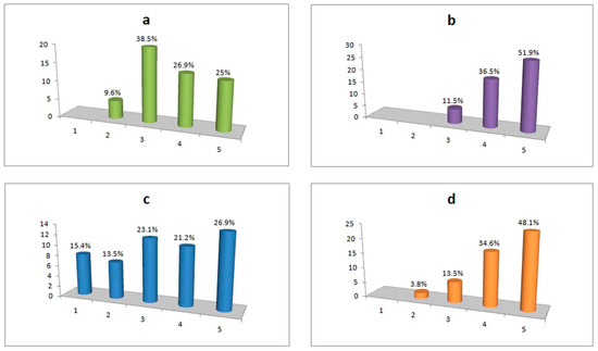 Specialists research statistics: (a) Sense of visit in relation to the corresponding real world; (b) Necessity of multimedia elements for the learning use of the application; (c) Influence of the degree of familiarity of educational staff with VR applications; (d) Push for a corresponding physical tour.
