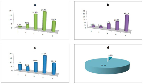 When comparing the said virtual tour with the corresponding physical tour, a percentage of 77.8% consider that it can entice a user to visit the corresponding real area of the bridge Quite a lot (20.4%), Much (35.2%), and Very much (22.2%) (Figure 10c), while a similar percentage (72.2%) considers that a VR experience cannot fully replace the corresponding traditional tour. At the same time, it is recorded that the vast majority of students, at a rate of 96.3% (Figure 10d), would like to use corresponding virtual reality applications in their other courses as well.