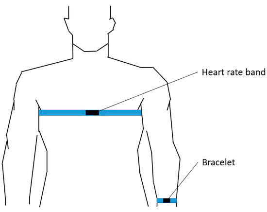 In this study, the experimental setup comprised two bracelets, two Polar H10 heart rate bands and two Android phones with Bluetooth functionality. The bracelets were equipped with a green LED sensor and a photodiode (PD) that converted light energy into electrical signals to collect PPG signals, as well as a LIS2DH12 sensor (STMicroelectronics, Geneva, Switzerland.) for capturing acceleration data. The Polar H10 heart rate band (Polar, Kempele, Finland.) was employed to monitor participants’ real-time ECG signals, which, after processing, served as a standard for heart rate comparison. The mobile phone received heart rate information from the Polar H10 heart rate band. Figure 1 shows the heart rate band and bracelet being worn. Figure 2 shows the participants in the experiment.