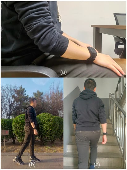 Pictures of participants during the experiment. (a) Sitting; (b) Outdoor walking; (c) Walking up and down stairs.