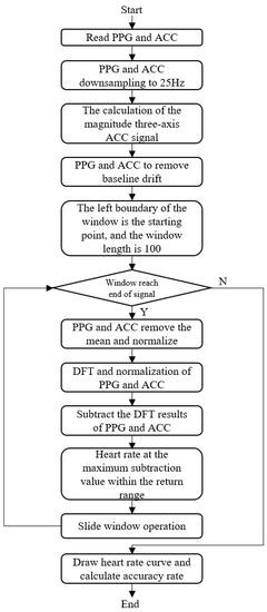 The traditional PPG heart rate extraction algorithm based on Discrete Fourier Transform (DFT) primarily consists of three components: baseline drift removal, discrete Fourier transform and motion artifact elimination. The algorithm architecture is depicted in Figure 3. At present, optical heart rate sensors are predominantly worn in the following positions: the ear, arm, wrist and finger [20,21]. Earlobe-based PPG sensors are less susceptible to motion artifacts than wrist-based sensors and provide a more accurate measurement of PPG signals. However, they may not be as convenient to wear and may require a tighter fit to the ear to reduce the effects of motion. The arm presents a good location for PPG measurement, due to its good blood perfusion and relative insensitivity to motion. Yet, it may be more challenging to access and may not offer the most precise measurement of PPG signals. The fingertip is a good location for PPG measurement because it has good blood perfusion and is relatively insensitive to motion. However, the fingertip may be more sensitive to changes in temperature and may not provide the most accurate measurement of PPG signals. Wrist-worn PPG sensors, despite being convenient and accessible, may not provide the most accurate measurement of PPG signals, as the wrist is more susceptible to motion artifacts. The measurement location or placement of an accelerometer is crucial for obtaining accurate and reliable data [22]. Depending on the application, accelerometers can be placed on various body parts. In summary, for the purpose of developing smart sports bracelets, the wrist was selected as the measurement site for this study’s algorithm.