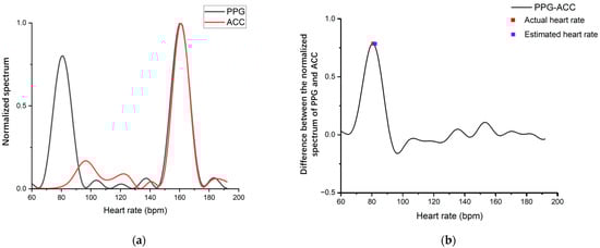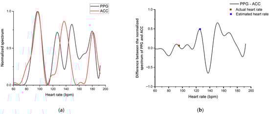 The spectral of participant 9. (a) The spectral of PPG and ACC; (b) Spectral difference between PPG and ACC.