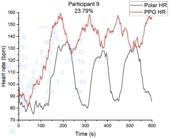 Participant 9’s heart rate of PPG and heart rate band.