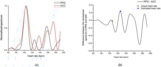 The spectral of participant 14. (a) The spectral of PPG and ACC; (b) Spectral difference between PPG and ACC.