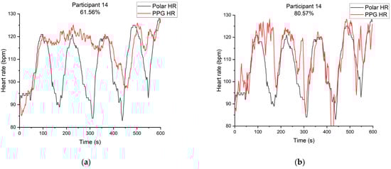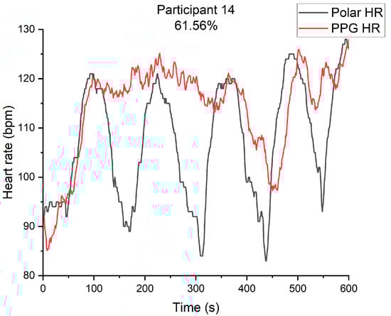 Participant 14’s heart rate of PPG and heart rate band.
