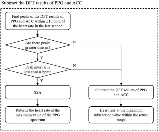 The flow chart for the improved heart rate calculation is presented in Figure 10. To improve the traditional algorithm’s step of subtracting the DFT results of PPG and ACC, we first determine the spectral overlap by examining the morphological characteristics of PPG and ACC spectra. Following the detection of overlap, we incorporate the SSA algorithm, which does not rely on spectrum subtraction, to recalculate the current heart rate and remove motion artifacts.