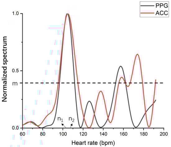 The spectra of participant 9 with corresponding parameters, where and are heart rates corresponding to peaks and m is the threshold of peaks.