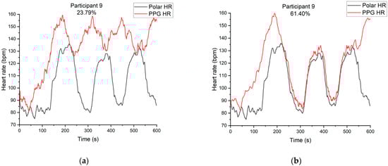 Based on the findings from the experimental dataset, we determined the value of m to be 0.4 and the value of n to be 3. In this scenario, the average accuracy of the samples without spectral overlap in the experimental dataset reached 95.95%, aligning with the algorithm results delineated in Chapter 2. Significantly, the accuracy of the samples exhibiting spectral overlap improved from 23.79% to 61.40%. The experimental results for participant 9 walking up and down stairs are presented in Figure 12. Figure 12a shows the accuracy rate obtained using the traditional algorithm, while Figure 12b shows the accuracy rate of the heart rate calculation result of the improved algorithm for samples with spectral overlap.