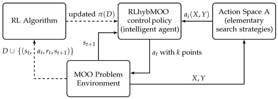 - RL Algorithm: To start the search for the RLhybMOO control policy, a problem-adequate RL algorithm family must be defined. It phrases the mathematical nature of the policy and its base initialization . During the training phase (indicated by dashed lines in Figure 1), the selected RL algorithm is fed by individual learning “experiences” , as gathered during an iterative episodic training process. The set of these experiences forms the experience memory D as a learning base for the control policy , repeatedly updated after the completion of every episodic training iteration until the final number of allowed training episodes is reached.