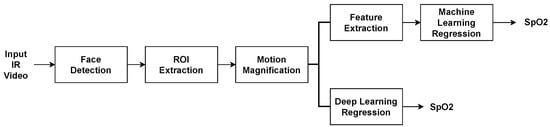 Eulerian Video Magnification (EVM) is a technique, proposed by Wu et al. [], in order to amplify and thus make visible very small motions, captured by current RGB cameras, that are normally invisible to the human eye. When applied to image photoplethysmography, Eulerian Video Magnification (EVM) can enhance the accuracy and sensitivity of the measurement of oxygen saturation (SpO2) levels. This is due to the fact that the EVM technique can detect even the slightest changes in skin blood flow [], providing a more detailed and precise measurement of oxygen saturation, or the patient’s physiological state in general, allowing for better monitoring and treatment of medical conditions. Thus, in this paper, we propose the use of EVM, as a preprocessing step to enhance the video content captured by the infrared camera. Recent research has explored and demonstrated various methods for estimating oxygen saturation levels using facial video with multimodal physiological data generation [] or via DC and AC component extraction of a spatio-temporal map using facial videos [].