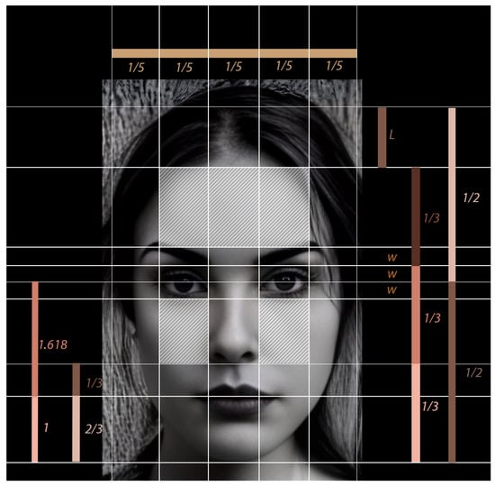 - Kaya, K.S.; Türk, B.; Cankaya, M.; Seyhun, N.; Coşkun, B.U. Assessment of Facial Analysis Measurements by Golden Proportion. Braz. J. Otorhinolaryngol. 2019, 85, 494–501. [Google Scholar] [CrossRef]