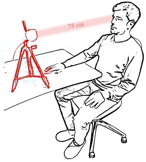It should be noted that the Viola–Jones algorithm may be sensitive to factors such as camera angle and position of the head with respect to the camera. However, we make the assumption that the participant’s head is facing the camera straight at their eye level, 75 cm away, as this was the setup during the experiment. This assumption is made in order to simplify the facial segmentation process and avoid dealing with the complexities that may arise from varying camera angles and head positions. Figure 3 depicts the experimental setup that was used during data acquisition. This setup was fixed for all subjects, therefore, minimising the risk of face identification and registration errors. The examination of the signal processing techniques used in this study will be presented in depth in the following section.