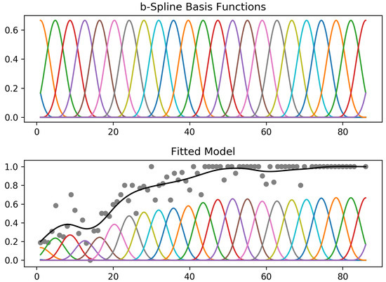 (Above) A family of b-spline basis functions. (below) Penalized B-splines allow us to automatically model non-linear relationships [].