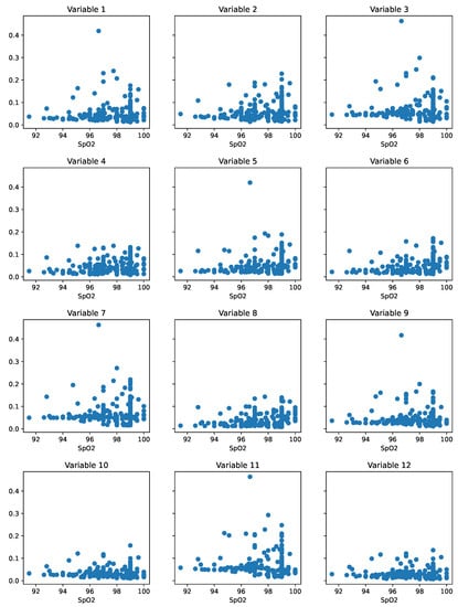 In previous studies, researchers have used the average of averages and the average of standard deviations from two colour channels of an RGB camera to extract relevant information [,,]. However, since we only have access to an infrared camera, which captures only one colour channel, we needed to adapt our approach. Therefore, we decided to explore whether the average of averages, the average of standard deviations, the standard deviation of averages, and the standard deviation of standard deviation can provide us with useful information that can improve the accuracy of our method. Our rationale behind using these statistical measures is based on the assumption that these values can help us quantify the distribution of pixel intensities within the image. In Figure 5, scatter plots for each of the 12 extracted variables are presented. It is evident from the scatter plots that different combinations of variable values can result in the same SpO2 value. This observation indicates the presence of non-uniqueness in the relationship between the variables and the SpO2 value. The non-uniqueness can be attributed to the complex physiological and environmental factors that affect SpO2 estimation, such as skin color, lighting conditions, and motion artifacts. It is important to note that the non-uniqueness of variable combinations can affect the accuracy and robustness of the SpO2 estimation algorithm. The combination of these variables has shown to improve the regression of SpO2 in our experiments; however, it is hard to visualize these dependencies.