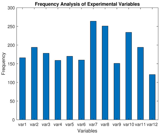 We adopt an approach in which we assign the extracted variables to the statistical characteristics of each frame sequence as shown above, where represents each of the three facial areas. This allows us to capture the variability in the variables within different facial regions and to identify which regions contribute the most to the overall SpO2 estimation. By constructing the collective histogram in Figure 6 containing the appearance frequency of each variable in the top-10 feature set from every machine learning algorithm, we are able to identify the most significant variables and their corresponding facial regions.