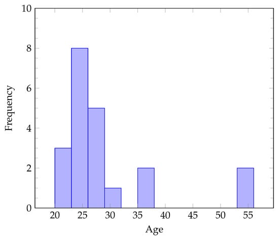 In Figure 7, we can see an histogram of the SpO2 measurement values in the collected dataset. In addition, Figure 8 contains the age distribution of all participants the dataset. It is evident from the histograms provided that the SpO2 measurement values are concentrated towards the higher end of the scale, with relatively fewer occurrences at the lower end of the spectrum. This shift to the right is a clear indication that the majority of the observations have higher SpO2 values, which may suggest a general trend towards better oxygen saturation levels among the studied population. It is not unexpected to observe a higher concentration of oxygen saturation readings towards the higher end of the scale for younger adults, as compared to older individuals. It is well documented in the medical literature that the baseline oxygen saturation levels of healthy individuals can vary based on their age, and that elderly individuals tend to have lower oxygen saturation readings compared to younger adults []. However, the underlying physiology of an individual is also an important factor that should be taken into consideration when evaluating a measurement reading. Various health conditions and lifestyle habits can affect the accuracy of pulse oximetry readings, which measure the oxygen saturation levels in the blood. For example, obesity, lung and cardiovascular diseases, emphysema, chronic obstructive pulmonary disease, congenital heart disease, and sleep apnea can lead to lower oxygen saturation levels []. Smoking can also impact the accuracy of pulse oximetry, especially if hypercapnia is present. Individuals with anemia may have normal oxygen saturation levels, but this may not indicate adequate oxygenation due to a lower amount of hemoglobin to carry oxygen []. For the previously stated reasons, it is essential to include individuals from a diverse demographic in any study or analysis of SpO2 measurements. This includes a representation of various age groups, both genders, individuals with a range of health statuses, smokers, and non-smokers. This helps to account for the different factors that can affect SpO2 readings. By including a representative sample of the population, the results of the study are more likely to be generalizable and relevant to a broader population. Furthermore, this helps to minimize any potential biases that may result from a limited sample, thereby increasing the reliability and validity of the results.